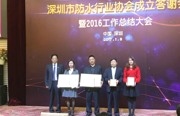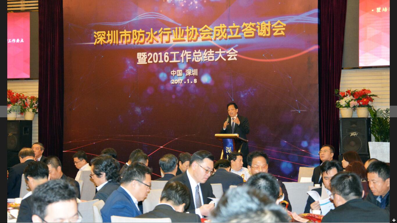 2017年1月8日,“深圳市防水行業(yè)協(xié)會成立答謝會暨2016工作總結大會”在南國錦繡鵬城隆重召開,會議以“開拓創(chuàng)新,和諧共進,不忘初心,逐夢前行”為主題。出席本次會議的有深圳市住建局,質檢總站、深圳市社會組織管理局等政府部門相關領導、中國建筑防水協(xié)會秘書長朱冬青、副會長苗燕、中國建筑業(yè)協(xié)會建筑防水分會秘書長曲慧、湖北工業(yè)大學院校專家、20多個省市協(xié)會領導以及各地防水企業(yè)代表共計240余人。