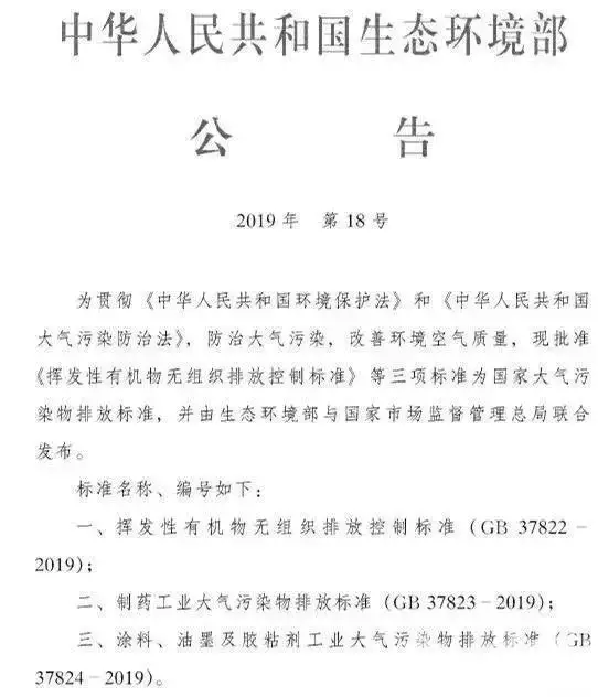 同時發(fā)布的還有《揮發(fā)性有機物無組織排放控制標準》(GB 37822-2019)、《制藥工業(yè)大氣污染物排放標準》(GB 37823-2019)等兩項強制性國家標準。