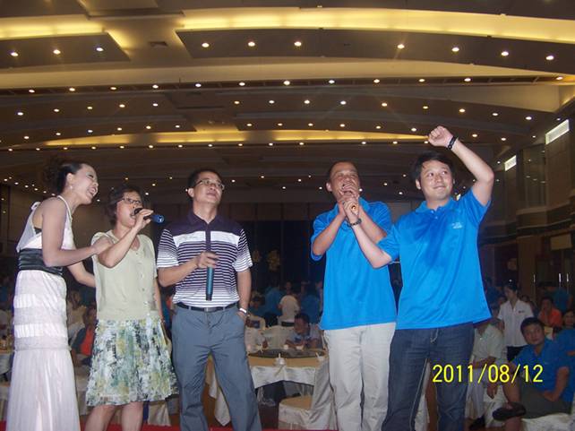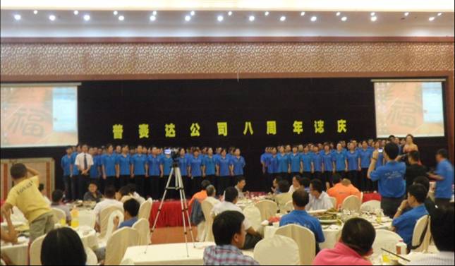 第三部分,慶典晚宴。8月12日晚6點慶典晚宴在天天漁村進(jìn)行,總經(jīng)理及嘉賓代表共同開啟生日香檳、切開生日蛋糕。我們普賽達(dá)人與到場約七十位嘉賓舉杯同慶普賽達(dá)8周歲生日。晚宴的高潮部分莫過于由普賽達(dá)人自編自導(dǎo)的文娛節(jié)目。盡管文娛表演沒有華麗的舞臺布置及燈光效果,但絲毫沒有影響我們整場晚會節(jié)目的表現(xiàn)力。節(jié)目首先以公司全員大合唱《不要認(rèn)為自己沒有用》拉開序幕,大合唱激情的表演力感動了在場的全體嘉賓;第二個節(jié)目是資材部極具新意與看點的《產(chǎn)品時裝秀》表演,自制的道具、恰到好處的臺詞解說及舞臺動作設(shè)計、夸張的表演獲得了臺下觀眾一次又一次熱烈的掌聲和歡呼聲,不僅如此,嘉賓沈春林教授還特意上臺為資材部這個節(jié)目做了現(xiàn)場采訪,使這個《產(chǎn)品時裝秀》真正要表達(dá)的含直入了觀眾的心底;市場部男女二人合唱《變臉》,其中男生劉輝不似明星卻勝似明星的歌聲再一次把晚會氣氛推向了高潮,他的歌聲低沉有力、余音繞梁,深深地打動了臺下觀眾的心弦,給我們留下了深刻的印象。