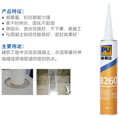 力鍵8260是單組分室溫濕氣固化聚氨酯密封膠,具有良好的密封性能和柔韌性能,對(duì)被粘基材無腐蝕,無污染,耐刺穿,易修補(bǔ),與水泥、石材等多種基材粘接性好。